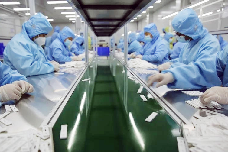 臨近年關,集慶生產車間內卻是一派火熱景象,全自動化生產設備機器轟鳴,灌裝、切條、組裝、封口、質檢……多條產線齊開動,工人和機器早已做好準備,快速擴能,優化產線,在資格獲批的第一時間,星夜馳援海孵新冠抗原試劑代工生產,跑出集慶速度。